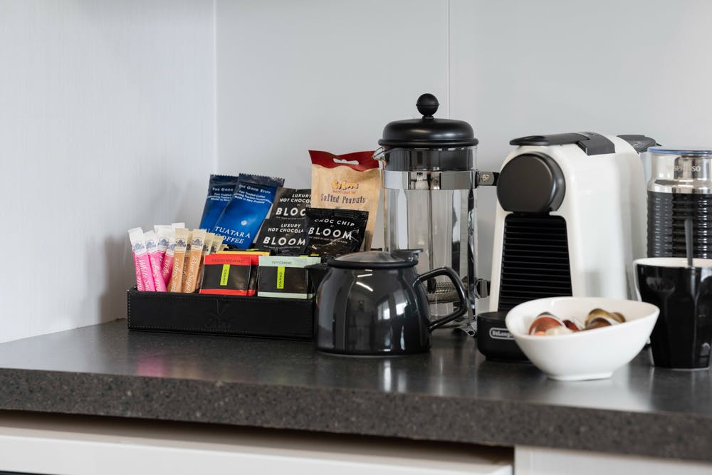 Fancy whipping up a home cooked meal from our fully fitted out kitchen or maybe a complimentary snack and a Nespresso or tea from our coffee station. Don’t feel like washing the dishes in our double bowl stainless steel sink, then simply pop them into the dishwasher and walk away. If you need space for your cold items our stainless-steel Samsung fridge/freezer will do the trick, with its ice maker cooling your drinks. Pots, pans, crockery and cutlery, this kitchen has it all.