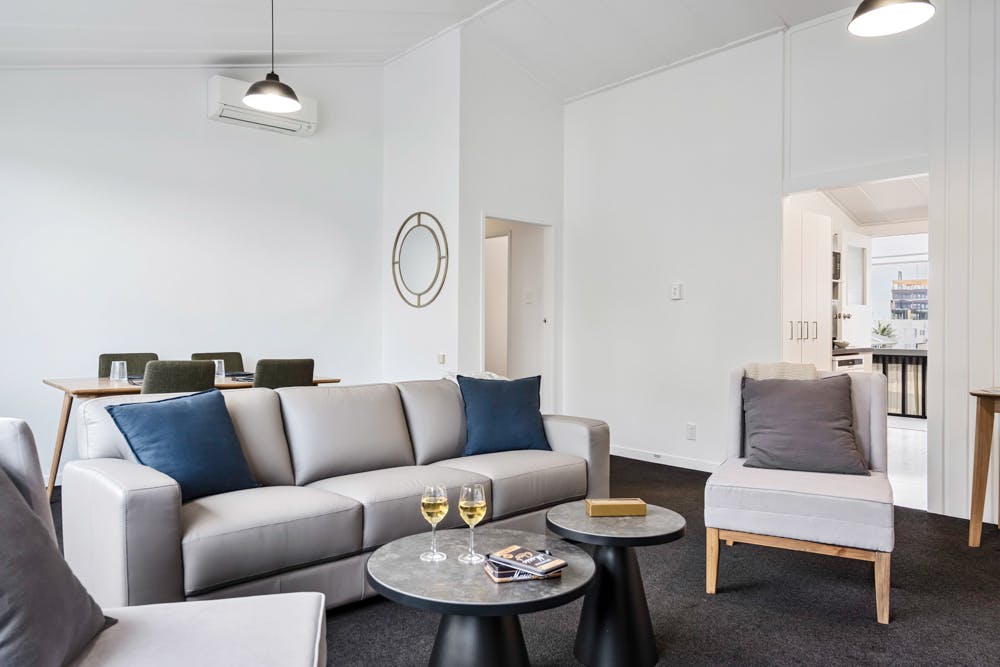 The captivating views from this beautifully appointed penthouse apartment are moody and ever changing with the seasons. Relax and enjoy the magical vistas over the bay from our 6-metre-long windowed living area. Turn on the heat pump to warm up or cool down and curl up on our 3-seater leather sofa. View your favourite shows on SKY TV or use your Netflix account on our 60-inch TV. Screen time not your thing, then read a book or play one of the many board games from our comfortable occasional chairs.