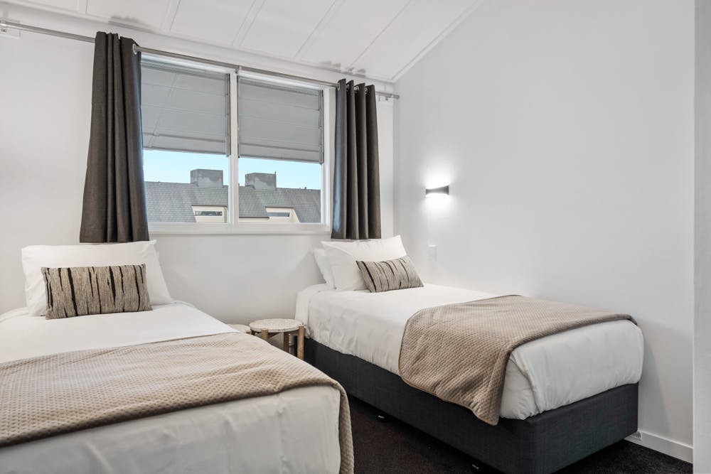 Guests will love the oversized King Single twin beds in the 2nd bedroom. Want to cuddle up, then simply connect the beds together and zip the comfortable mattress up to make a Super King bed. Another dedicated air conditioning unit is in this room, along with a wardrobe, corner bookshelf & wall mirror. White terrazzo side tables complete the look.